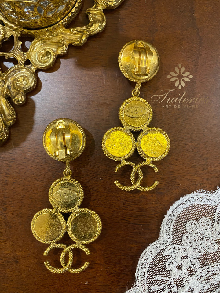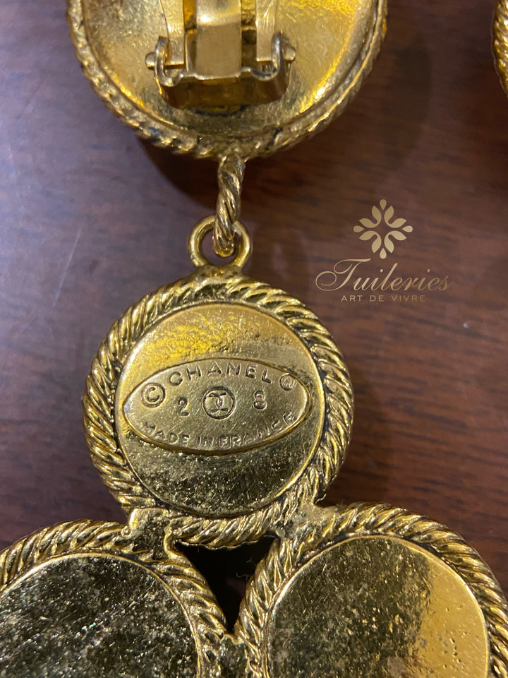 These earrings embody the bold color palette and baroque-inspired composition that defined the decade’s opulent aesthetic. The gold rope-textured metal outlines a striking structure adorned with vivid green, blue, and orange enamel cabochons, creating a lively visual rhythm. A pearl-like stud adds an elegant balance at the top, while the signature interlocking CC dangles gracefully below, capturing the essence of vintage Chanel glamour.