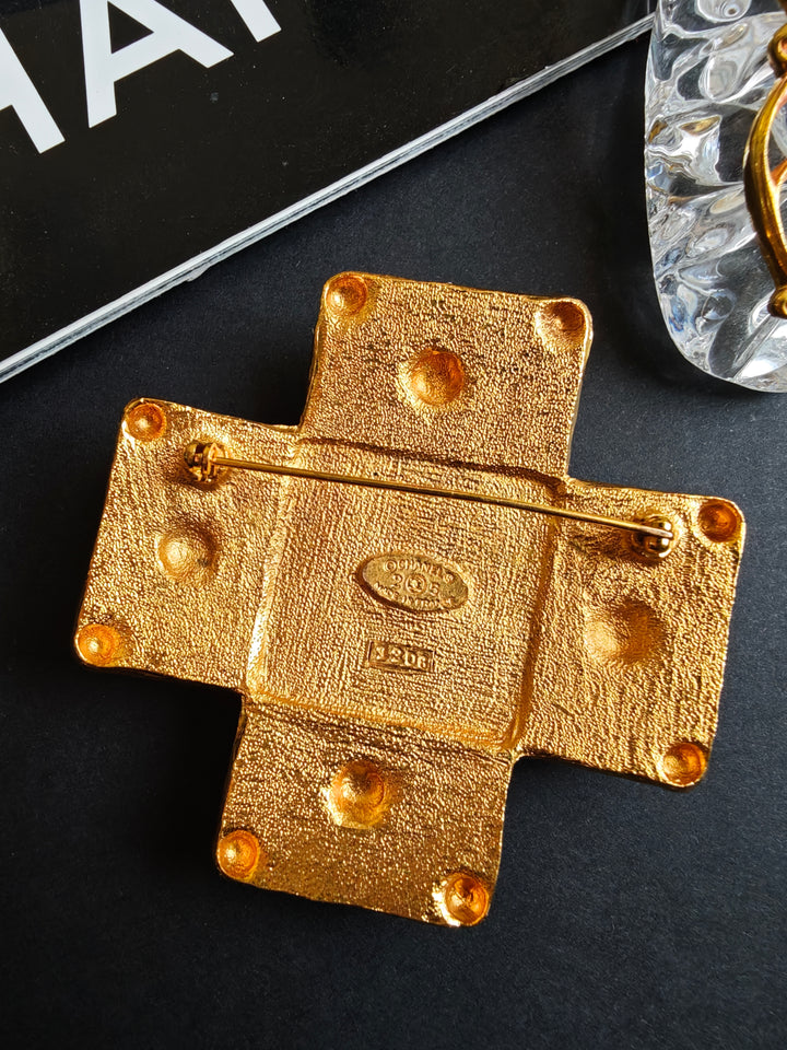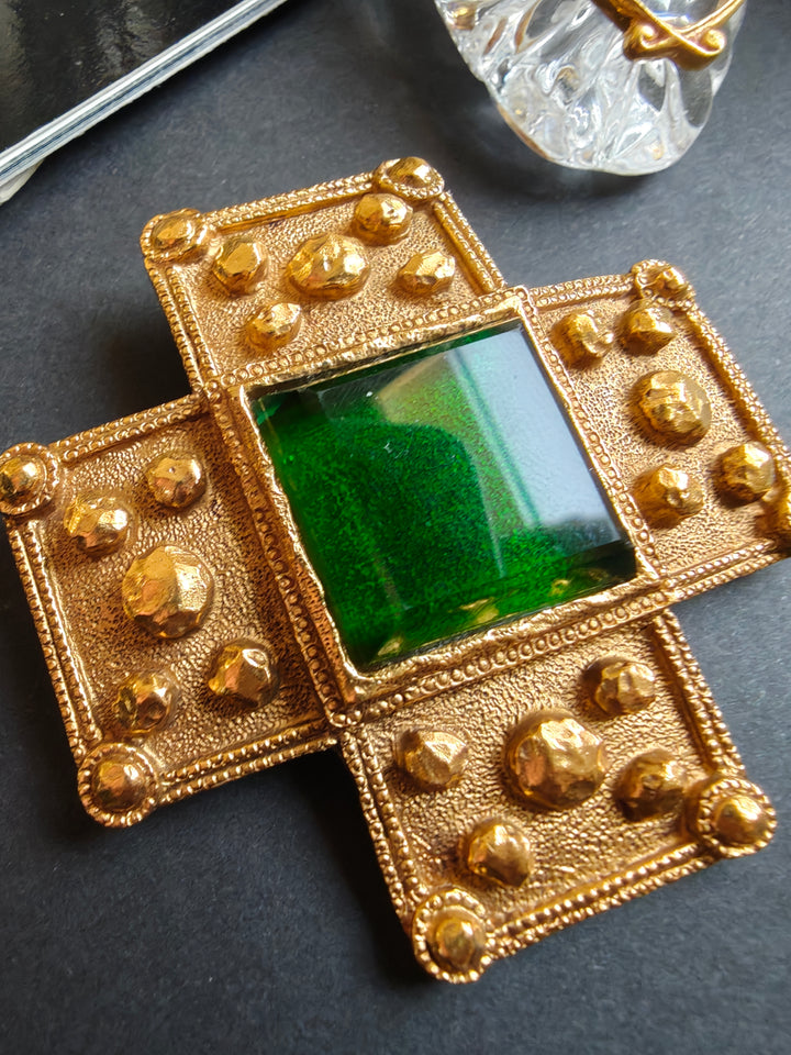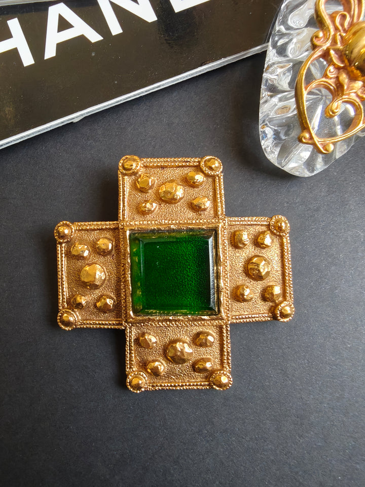 Chanel 1991 “Byzantine Cross” Brooch with Green Pâte de verre,Cabochon