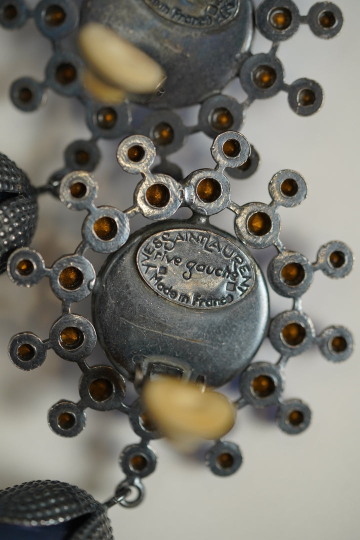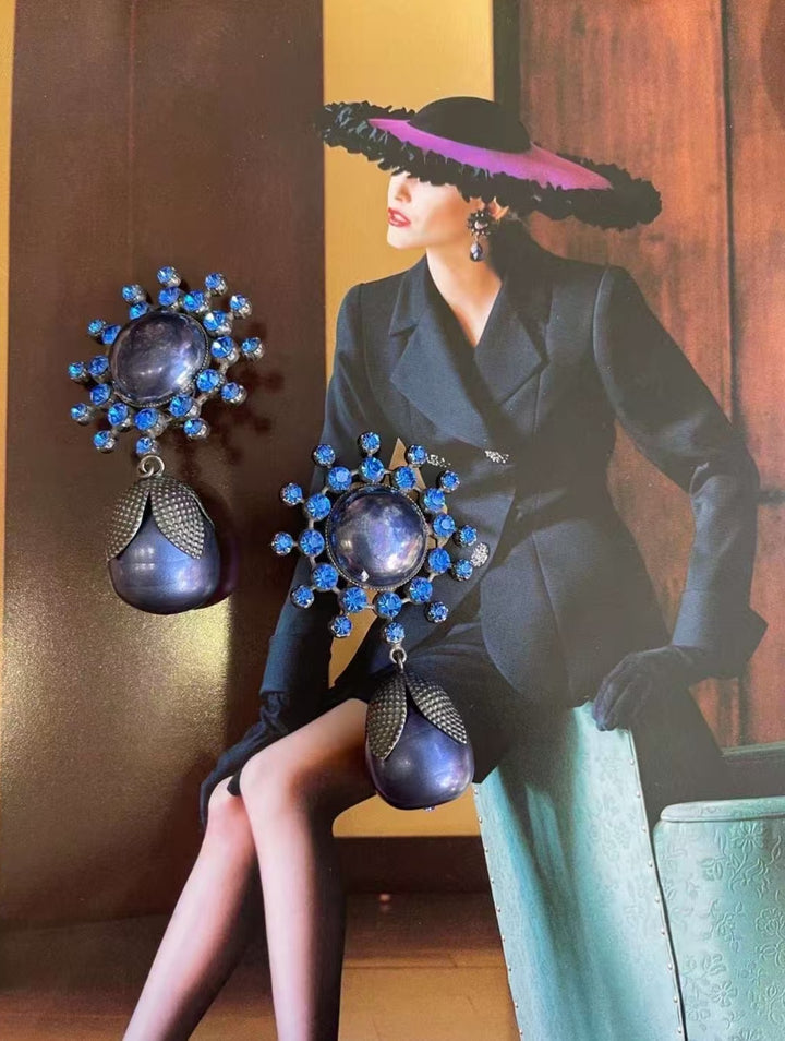 These blue glass pearl clip-on earrings from the Yves Saint Laurent Fall/Winter 1995 collection are among the most sculptural and theatrical creations of the season. Measuring 71mm in total length with a 24mm drop and weighing 30g each, they possess a remarkable sense of substance and presence. The central cabochon, a deep blue glass pearl with the luminous depth of a midnight sky, is surrounded by pavé-set sapphire-blue crystals arranged in a radiant, crown-like motif that draws the eye instantly. The teardrop pendant below is wrapped in textured metal scales, adding a touch of modern sophistication and enigmatic allure. Embodying YSL’s signature 1990s aesthetic—where strength meets opulence—this design fuses sculptural elegance with gothic sensuality, creating a statement piece that remains timeless and irresistibly dramatic.